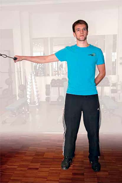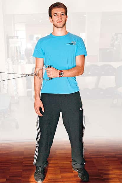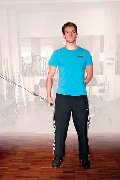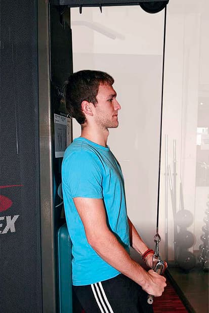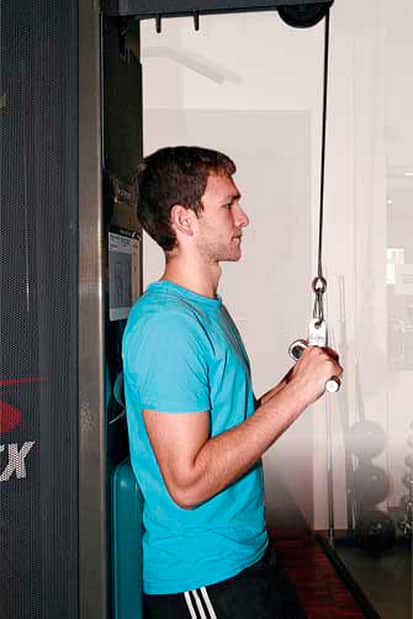 12 / 26 Krafttraining 4.) Das Armstrecken am Zuggerät trainiert den Trizeps. Die Oberarme liegen am Körper, die Unterarme werden nach unten gestreckt. 13 / 26 Die Ellenbogen bleiben seitlich am Körper, die Schultern sind hinten unten, der Brustkorb ist aufrecht.