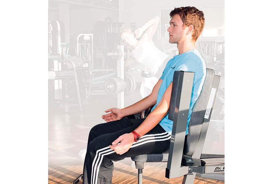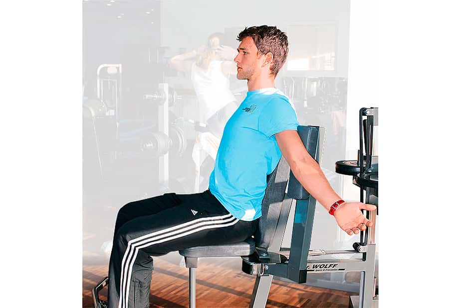 8 / 26 Krafttraining 2 a) Die Rückenpresse trainiert die obere Rückenmuskulatur. Die hier trainierten Muskeln beugen der bei Motorradfahrern häufig zu beobachtenden Rundrückenhaltung vor. 9 / 26 Krafttraining 2 b) Die Arme werden gegen die Polster nach hinten bewegt. Dabei werden die Schulterblätter hinten zusammengeführt. Die Schultern bleiben während der Übung unten.